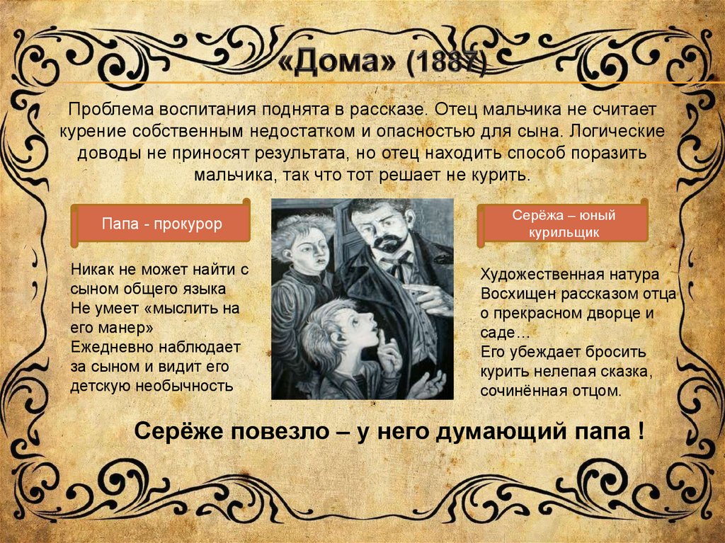 Проблема воспитания поднята в рассказе. Отец мальчика не считаеткурение собственным недостатком и опасностью для сына. Логические