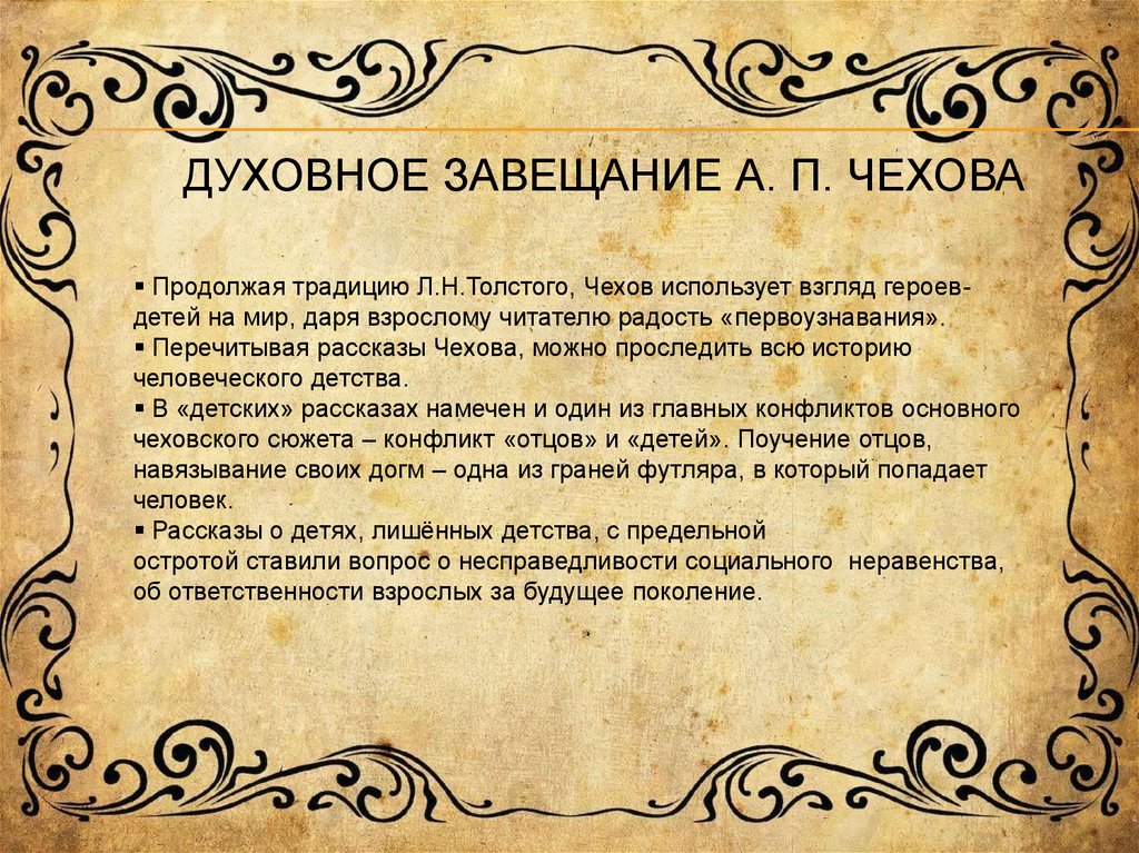 ДУХОВНОЕ ЗАВЕЩАНИЕ А. П. ЧЕХОВАПродолжая традицию Л.Н.Толстого, Чехов использует взгляд героевдетей на мир, даря взрослому читателю радость «первоузнавания».