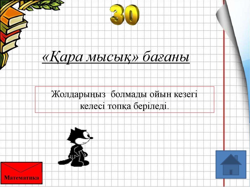 Ойын шарты:Қызыл конверттегі «Қара мысық» бағаны түссе жолыңыздың