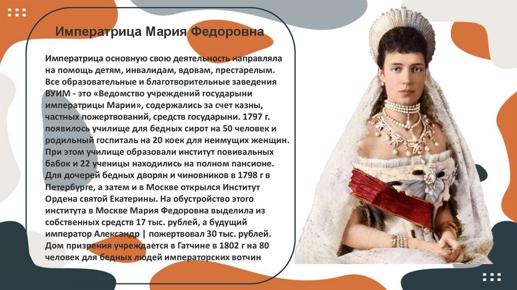 Императрица Мария ФедоровнаИмператрица основную свою деятельность направляла
