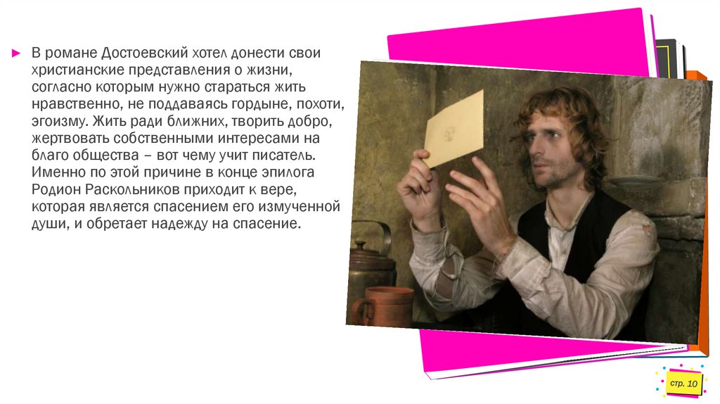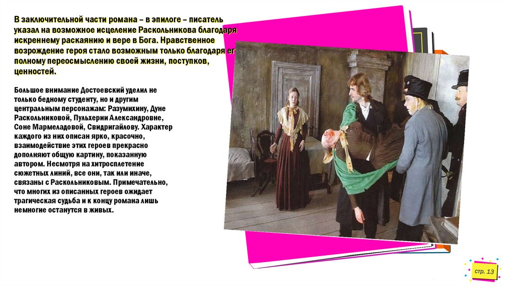 В заключительной части романа – в эпилоге – писательуказал на возможное исцеление Раскольникова благодаря