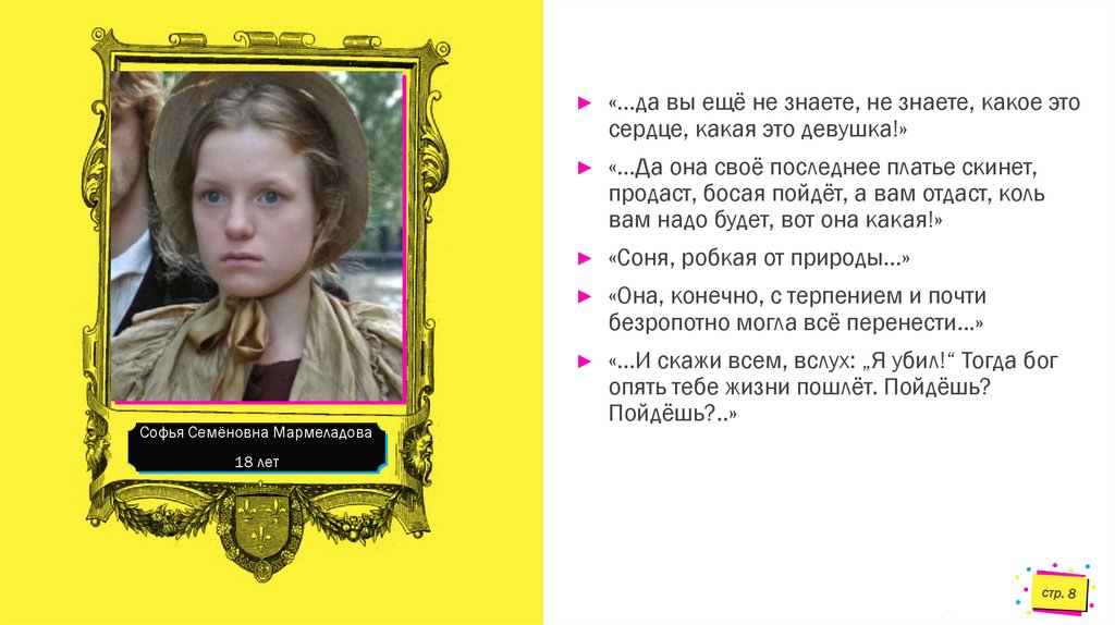 Софья Семёновна Мармеладова«...да вы ещё не знаете, не знаете, какое это
