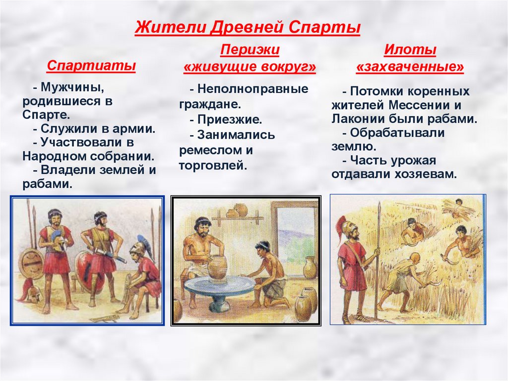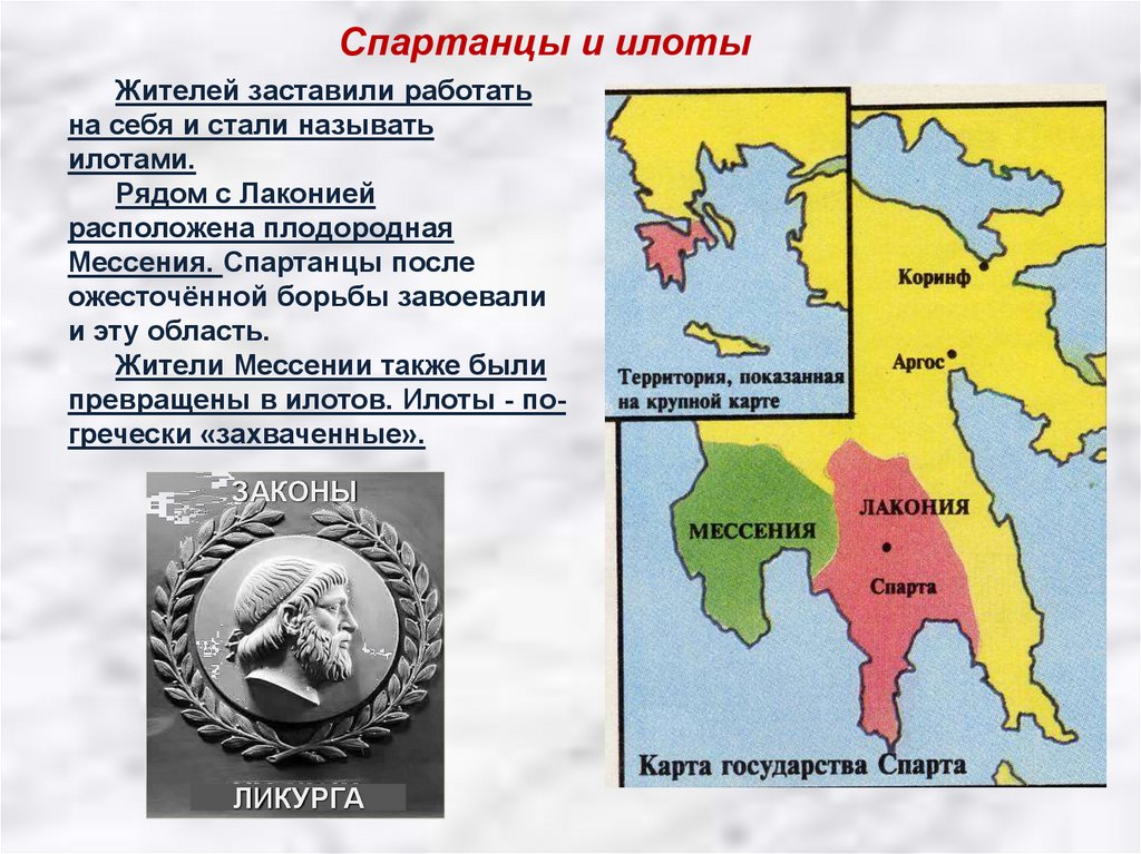 Спартанцы и илотыВ Лаконии и Мессении илоты составляли большинство населения.