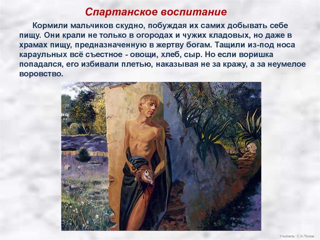 Спартанское воспитаниеКормили мальчиков скудно, побуждая их самих добывать себе