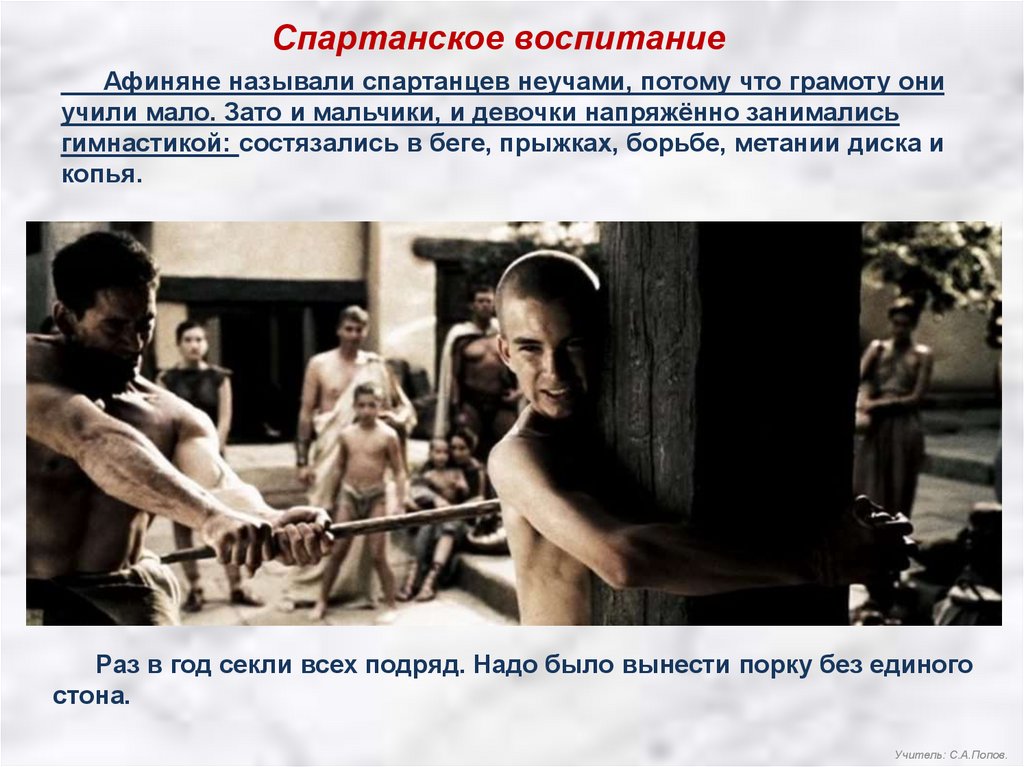 Спартанское воспитаниеЗа играми и занятиями детей присматривали старики. Они