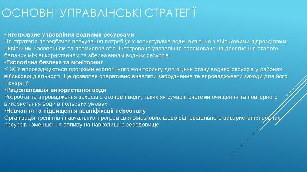 ОСНОВНІ УПРАВЛІНСЬКІ СТРАТЕГІЇ•Інтегроване управління водними ресурсами