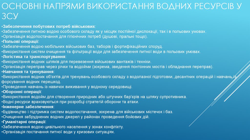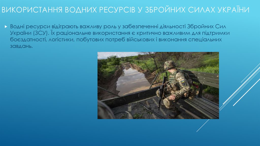 ВИКОРИСТАННЯ ВОДНИХ РЕСУРСІВ У ЗБРОЙНИХ СИЛАХ УКРАЇНИВодні ресурси відіграють важливу роль у забезпеченні діяльності Збройних Сил