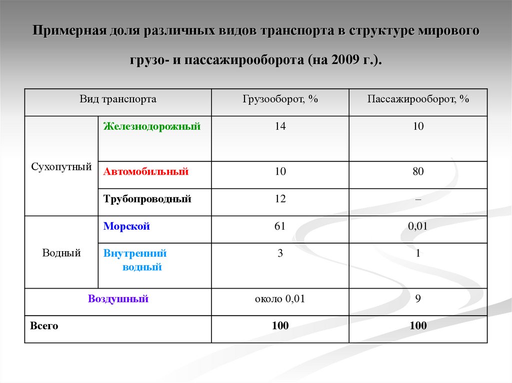 2. Примерная доля различных видов транспорта в структуре мирового грузо- и пассажирооборота (на 2009 г.).