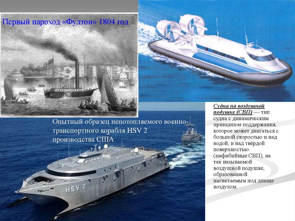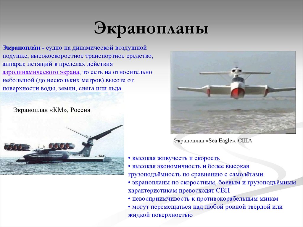 • экранопланы по скоростным, боевым и грузоподъёмным