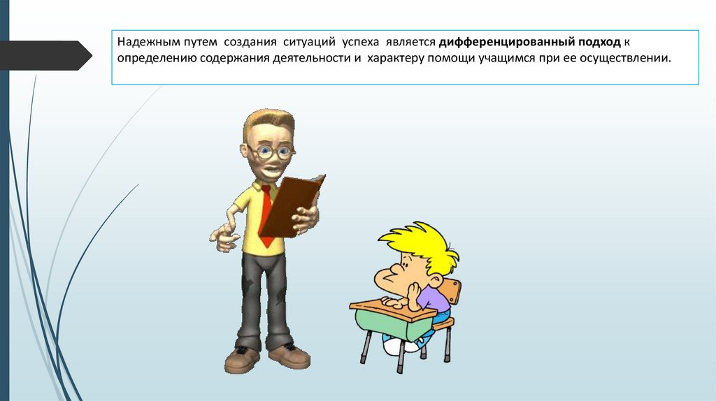 Надежным путем создания ситуаций успеха является дифференцированный подход копределению содержания деятельности и характеру помощи учащимся при ее осуществлении.