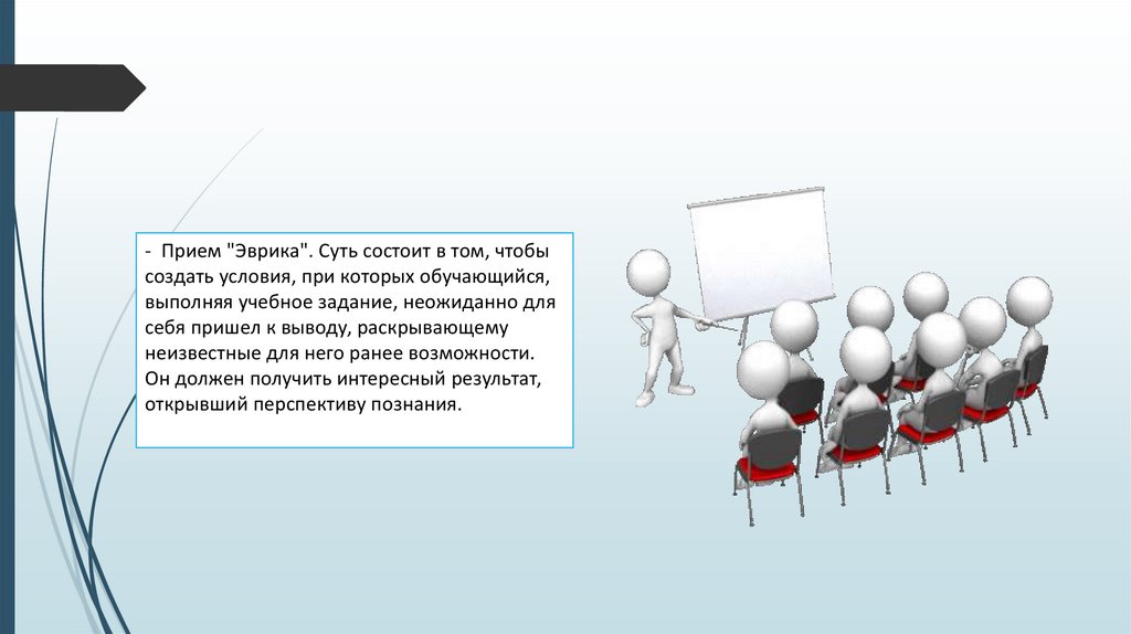 - Прием "Эврика". Суть состоит в том, чтобысоздать условия, при которых обучающийся,