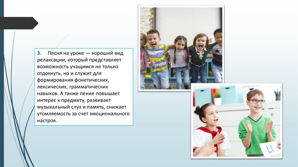 3. Песня на уроке — хороший видрелаксации, который представляет