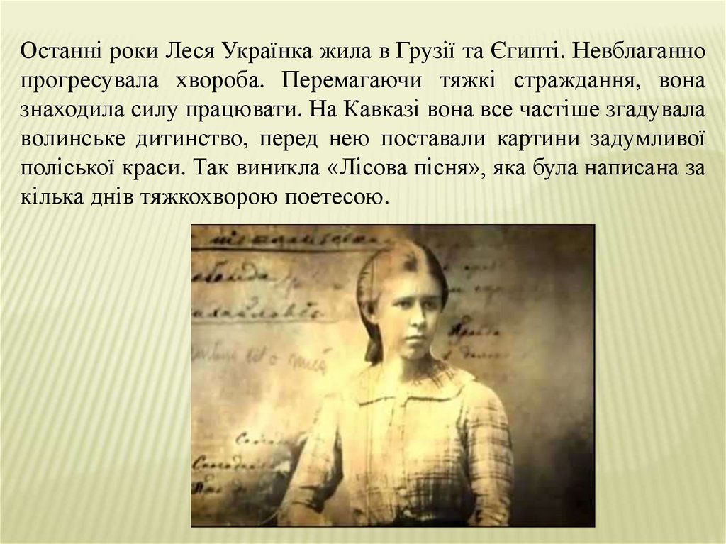 Останні роки Леся Українка жила в Грузії та Єгипті. Невблаганнопрогресувала хвороба. Перемагаючи тяжкі страждання, вона
