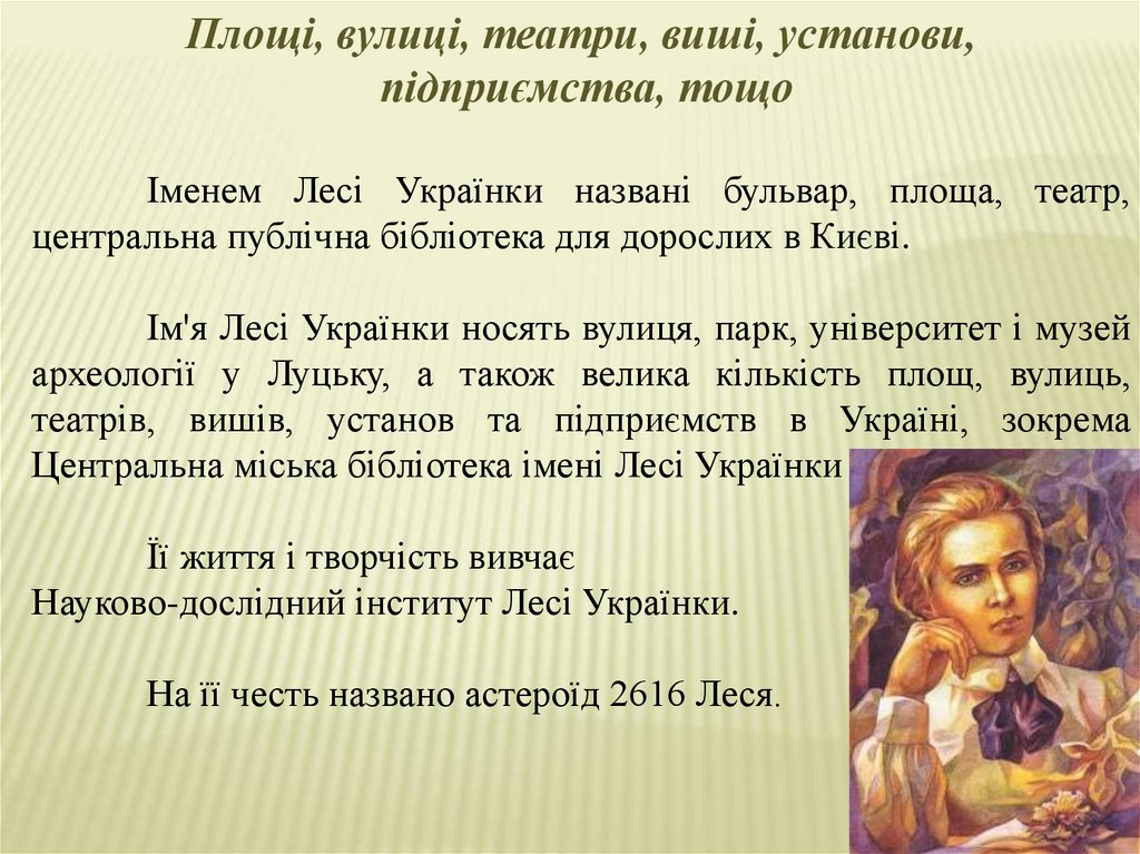 Ім'я Лесі Українки носять вулиця, парк, університет і музей