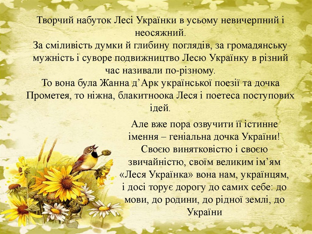 Творчий набуток Лесі Українки в усьому невичерпний інеосяжний.