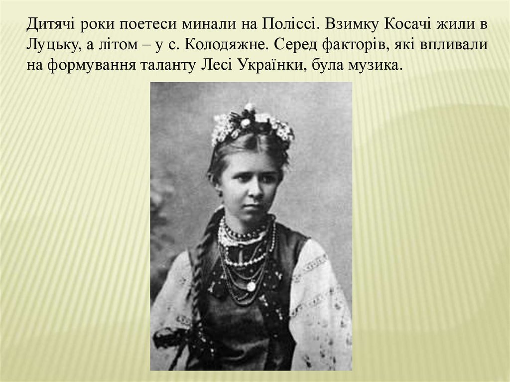 Дитячі роки поетеси минали на Поліссі. Взимку Косачі жили вЛуцьку, а літом – у с. Колодяжне. Серед факторів, які впливали