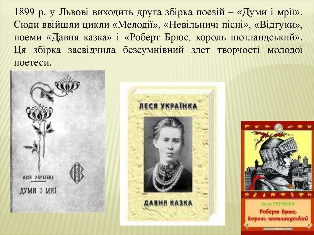 1899 р. у Львові виходить друга збірка поезій – «Думи і мрії».Сюди ввійшли цикли «Мелодії», «Невільничі пісні», «Відгуки»,