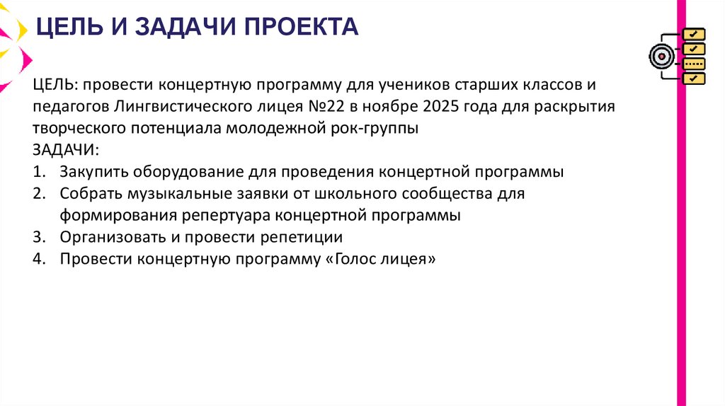 ЦЕЛЬ И ЗАДАЧИ ПРОЕКТАЦЕЛЬ: провести концертную программу для учеников старших классов и