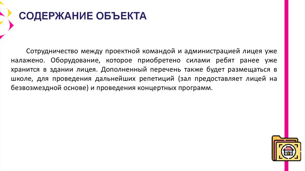 СОДЕРЖАНИЕ ОБЪЕКТАСотрудничество между проектной командой и администрацией лицея уже
