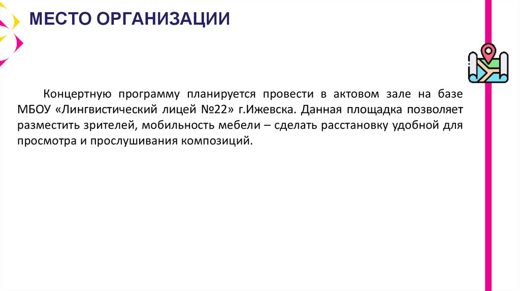 МЕСТО ОРГАНИЗАЦИИКонцертную программу планируется провести в актовом зале на базе
