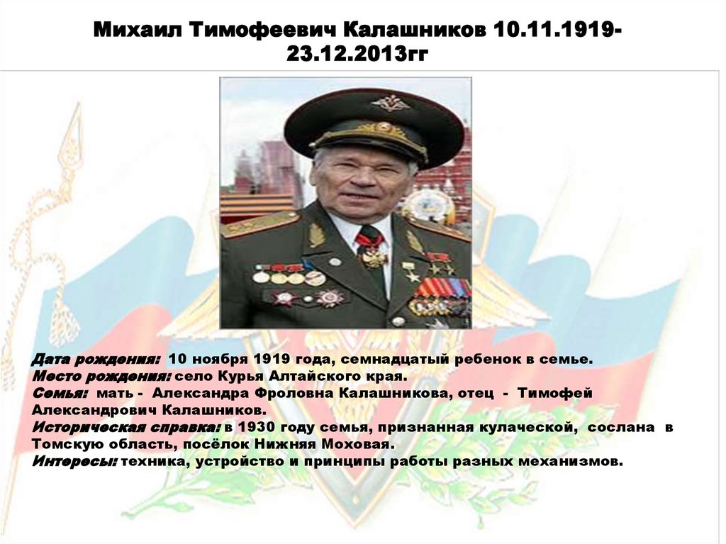 Михаил Тимофеевич Калашников 10.11.191923.12.2013ггДата рождения: 10 ноября 1919 года, семнадцатый ребенок в семье.