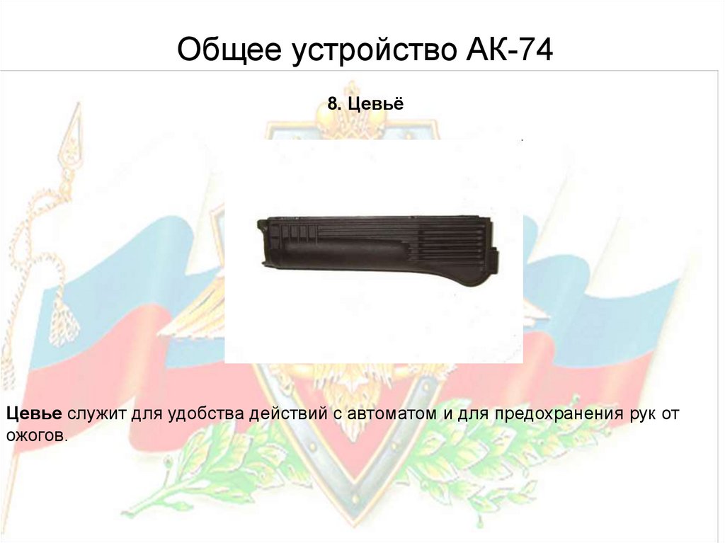 Цевье служит для удобства действий с автоматом и для предохранения рук от