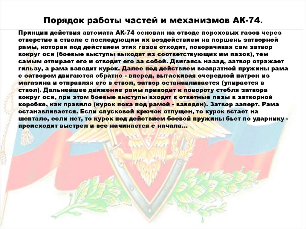 Порядок работы частей и механизмов АК-74.Принцип действия автомата АК-74 основан на отводе пороховых газов через