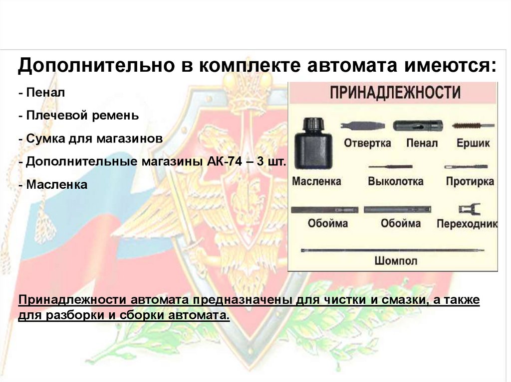 Принадлежности автомата предназначены для чистки и смазки, а также
