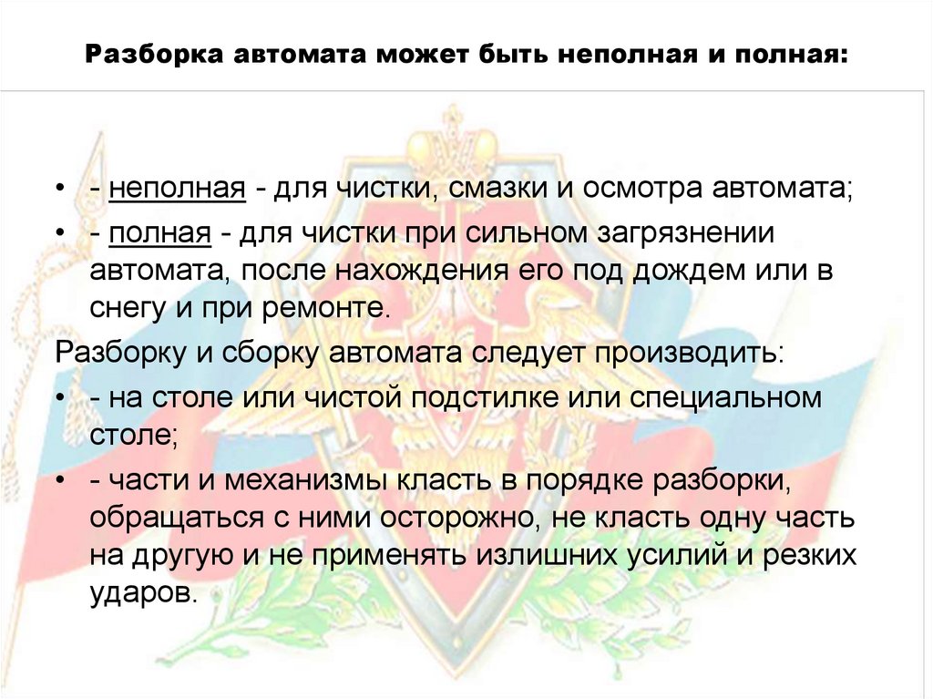 Разборка автомата может быть неполная и полная:• - неполная - для чистки, смазки и осмотра автомата;