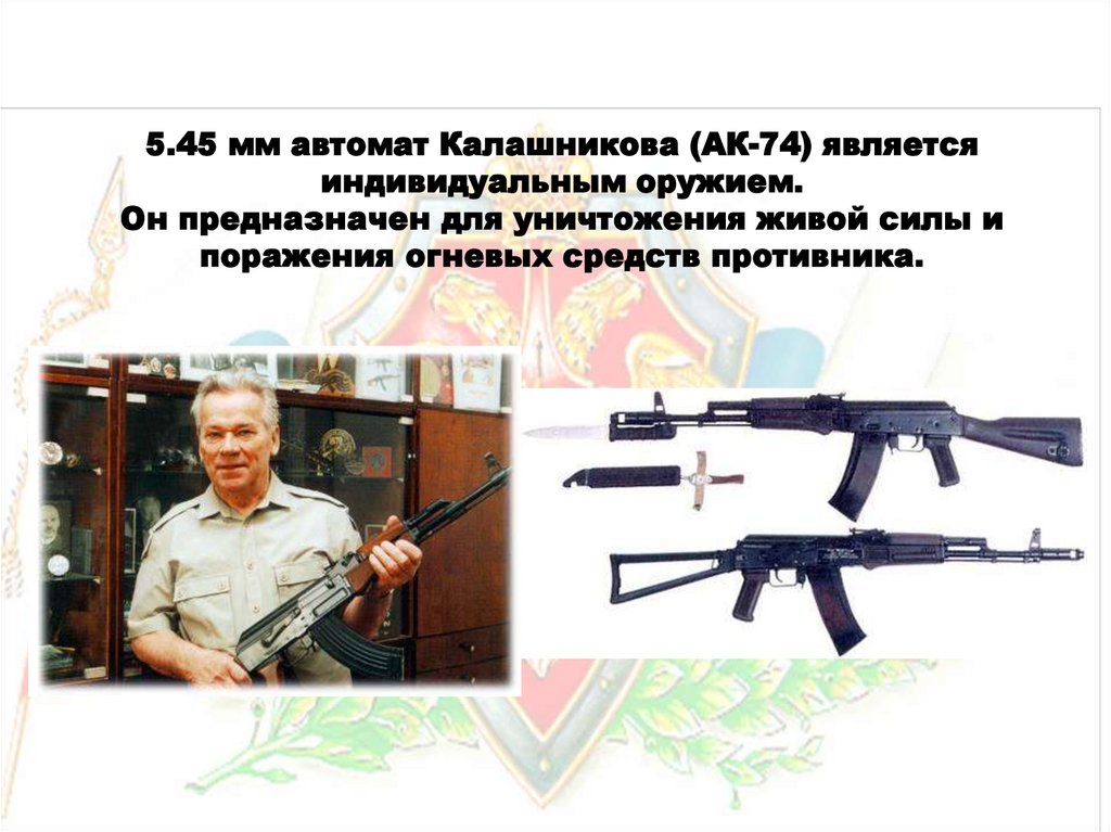 5.45 мм автомат Калашникова (АК-74) являетсяиндивидуальным оружием.