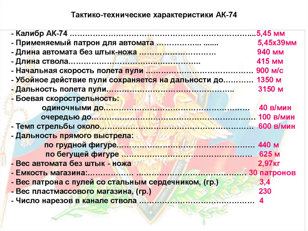 Тактико-технические характеристики АК-74- Калибр АК-74 ……………………………………………………………....5,45 мм