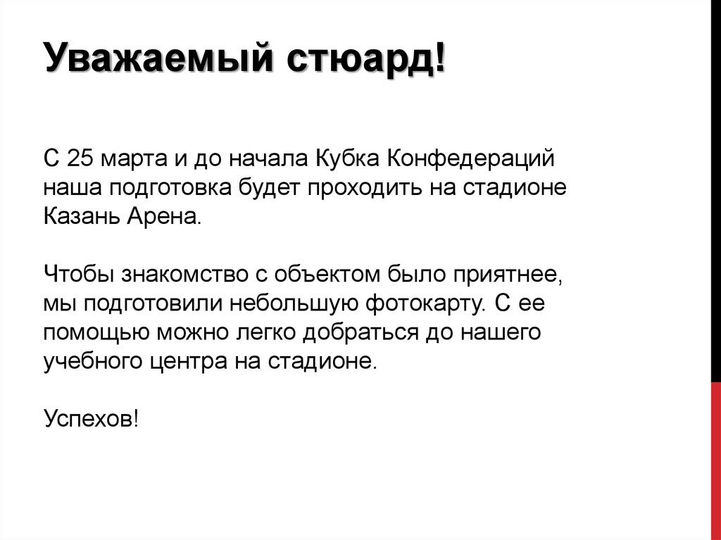 Уважаемый стюард!С 25 марта и до начала Кубка Конфедераций
