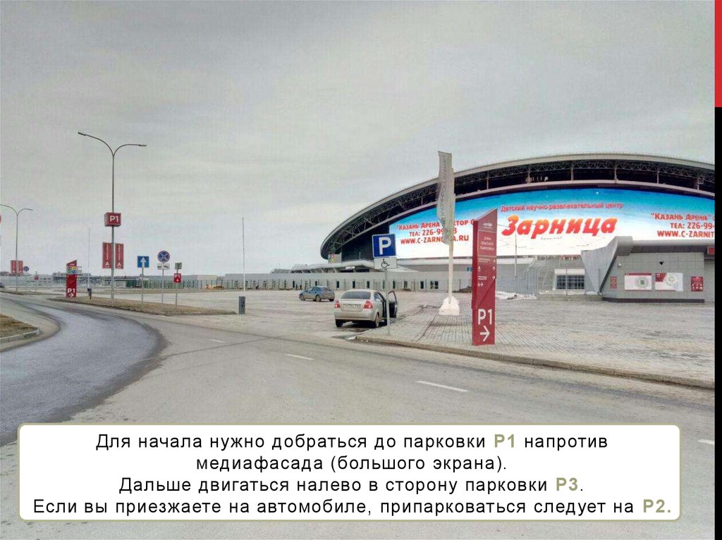 Для начала нужно добраться до парковки P1 напротивмедиафасада (большого экрана).