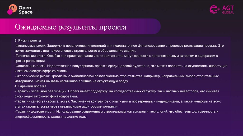 -Гарантии успешной реализации: Проект имеет поддержку как государственных структур, так и частных инвесторов, что снижает