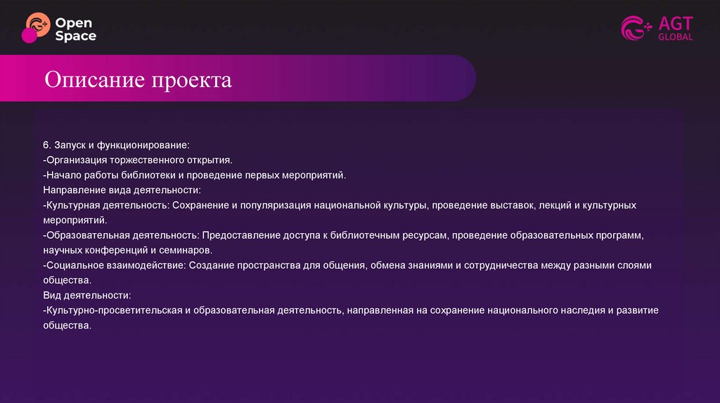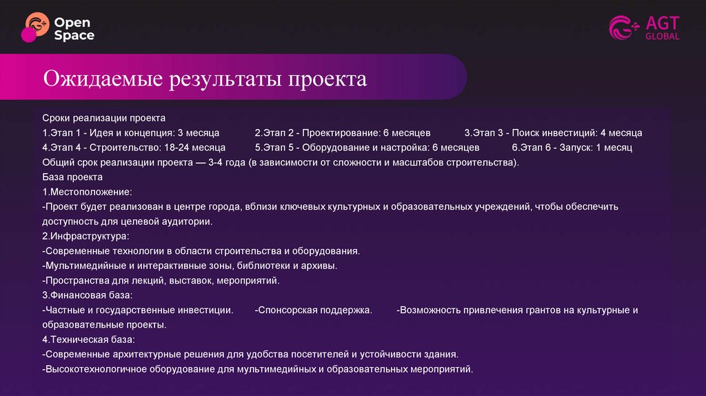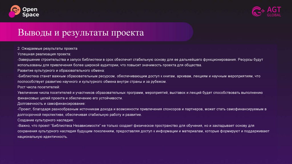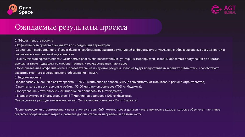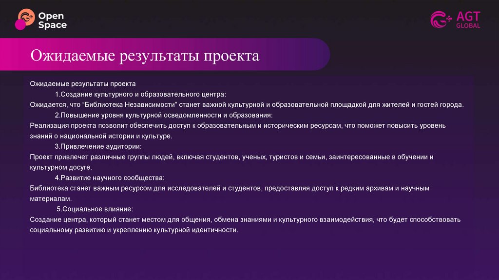 -Социальная эффективность: Проект будет способствовать развитию культурной инфраструктуры, улучшению образовательных возможностей и