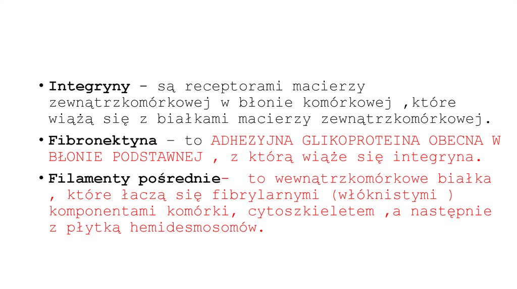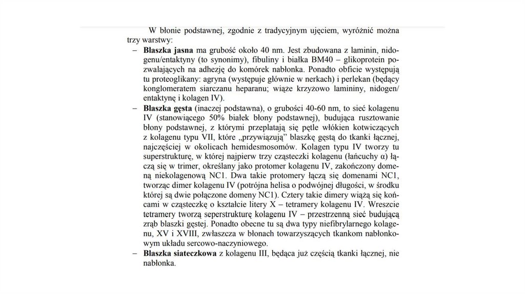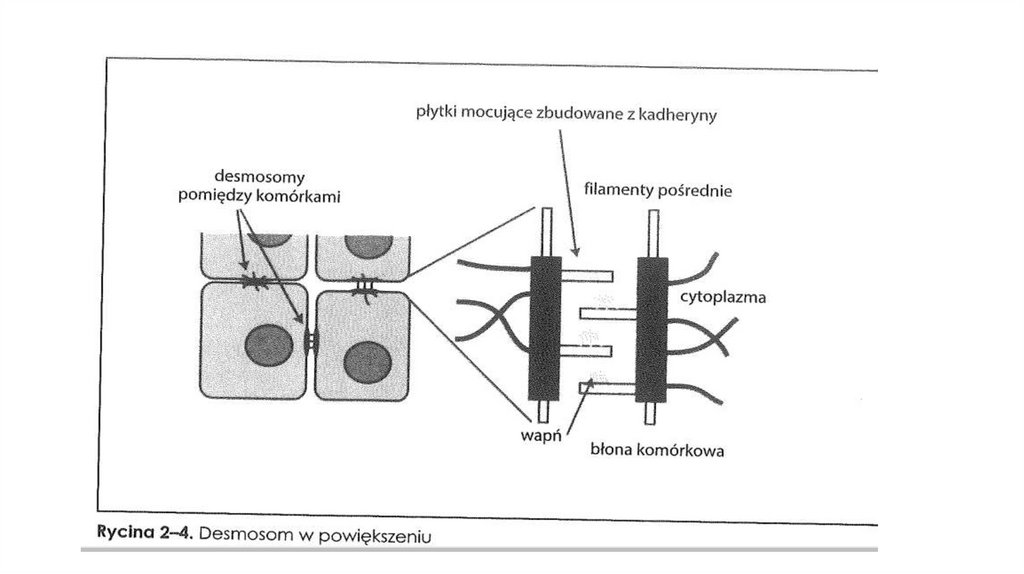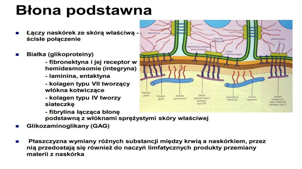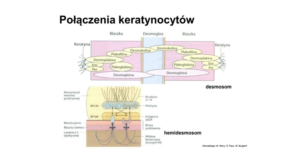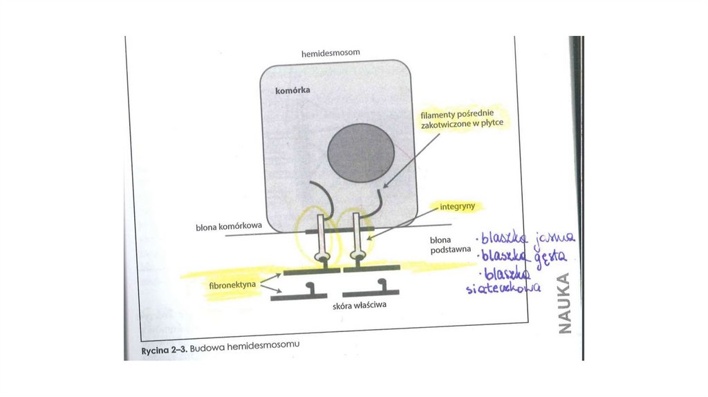 • Półdesmosomy, hemidesmosomy – struktury łączącekomórki naskórka (keratynocyty w warstwie