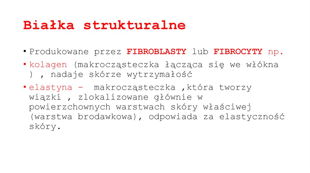 Białka strukturalne• Produkowane przez FIBROBLASTY lub FIBROCYTY np.