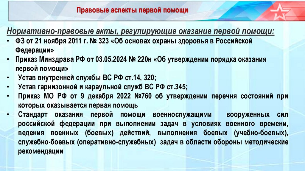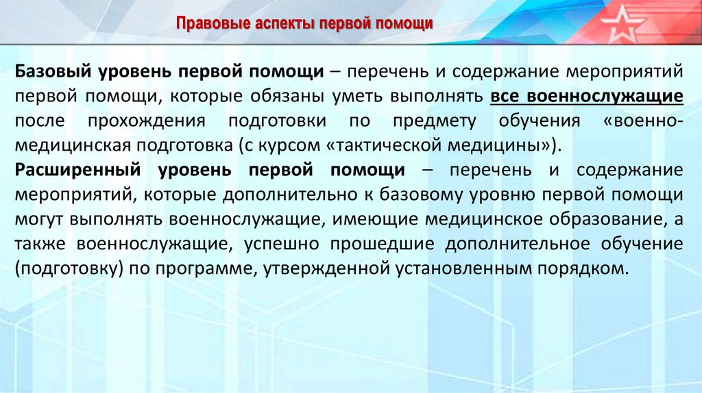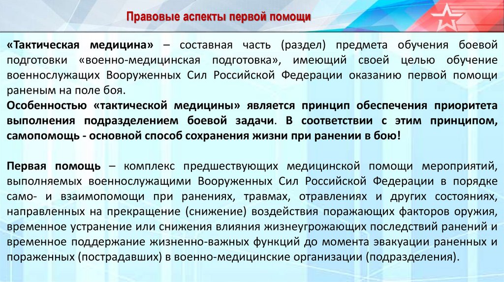 Правовые аспекты первой помощи«Тактическая медицина» – составная часть (раздел) предмета обучения боевой
