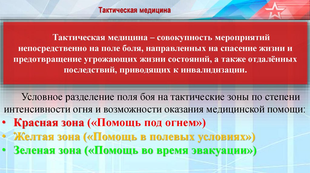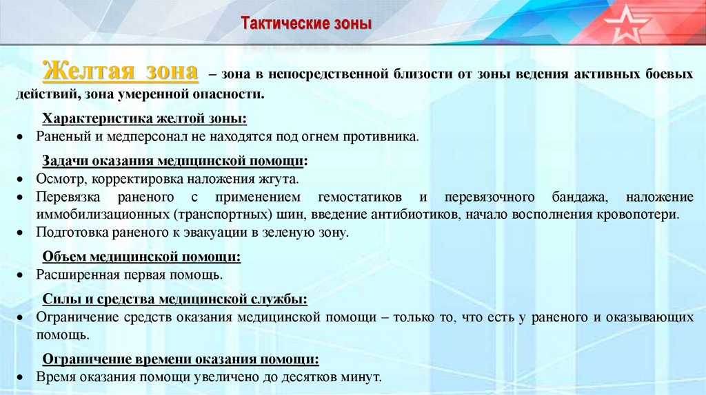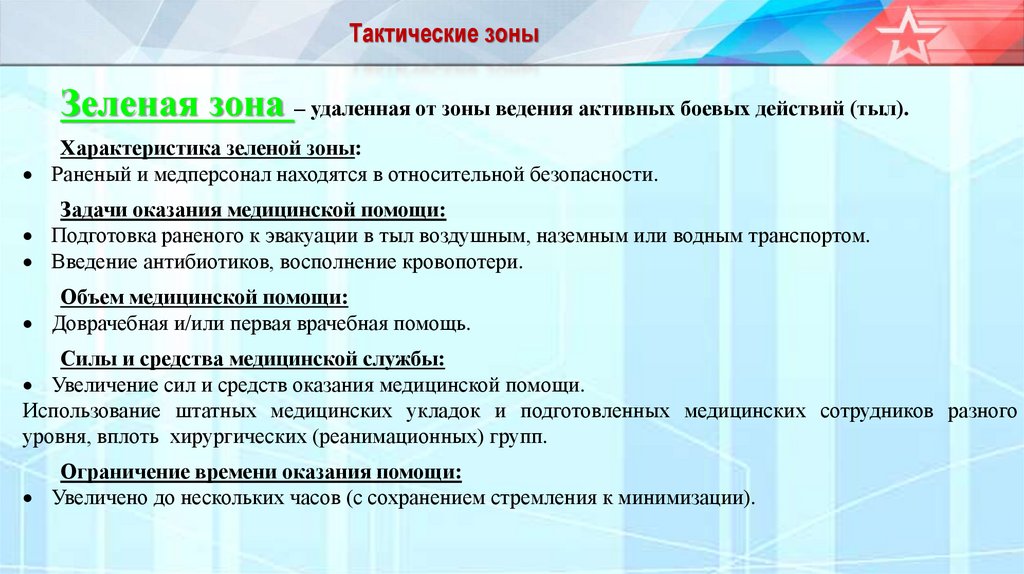 Тактические зоныКрасная зона – зона ведения активных боевых действий, зона высокой опасности.
