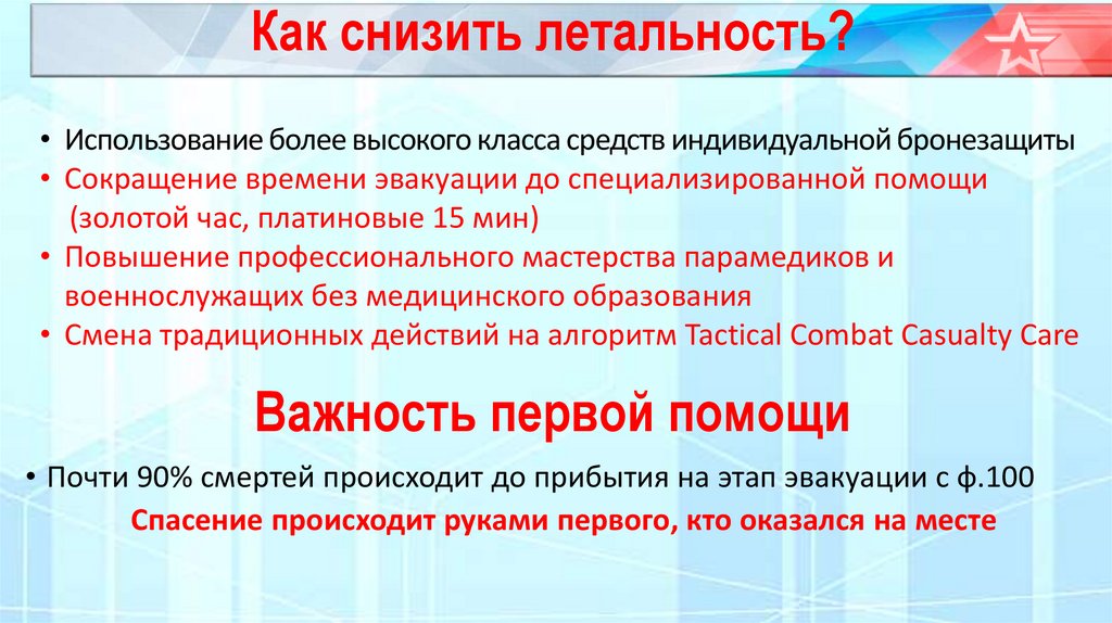 • Смена традиционных действий на алгоритм Tactical Combat Casualty Care