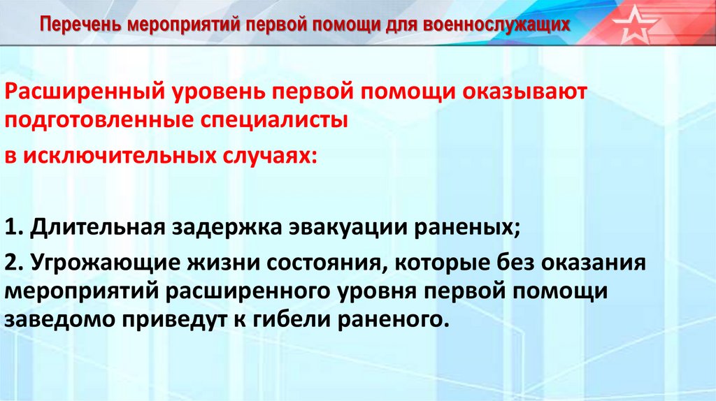 Перечень мероприятий первой помощи для военнослужащихРасширенный уровень первой помощи оказывают