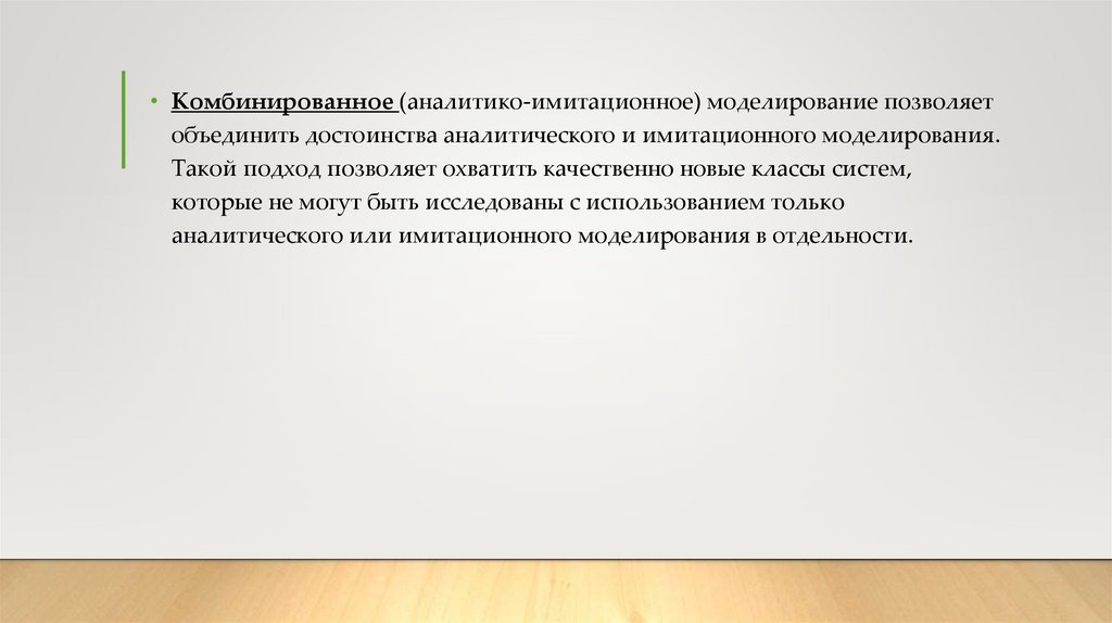 • Комбинированное (аналитико-имитационное) моделирование позволяетобъединить достоинства аналитического и имитационного моделирования.