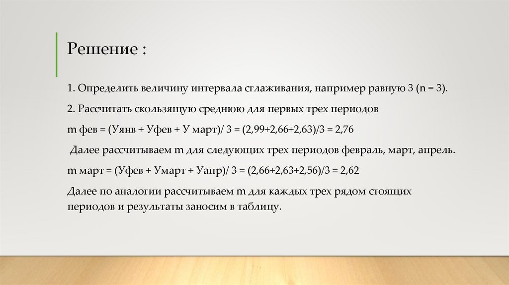 m фев = (Уянв + Уфев + У март)/ 3 = (2,99+2,66+2,63)/3 = 2,76