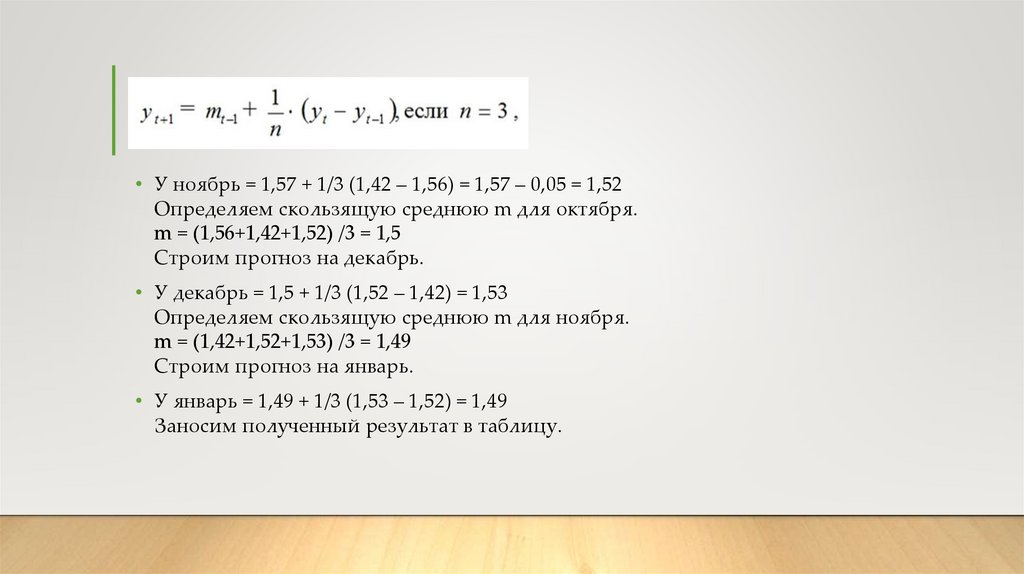 • У ноябрь = 1,57 + 1/3 (1,42 – 1,56) = 1,57 – 0,05 = 1,52Определяем скользящую среднюю m для октября.