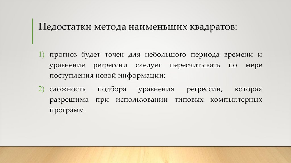 Недостатки метода наименьших квадратов:1) прогноз будет точен для небольшого периода времени и