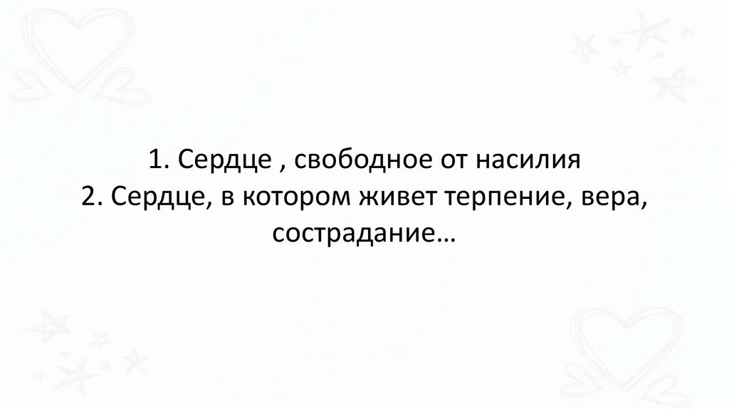 1. Сердце , свободное от насилия2. Сердце, в котором живет терпение, вера,