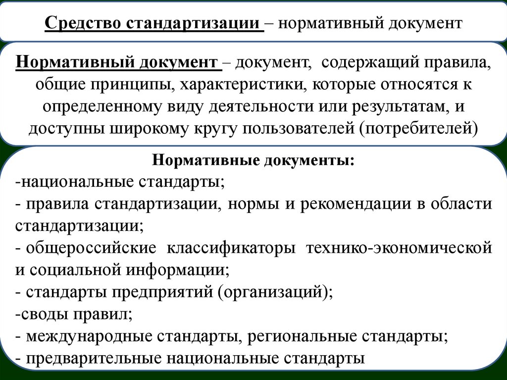 Средство стандартизации – нормативный документНормативный документ – документ, содержащий правила,