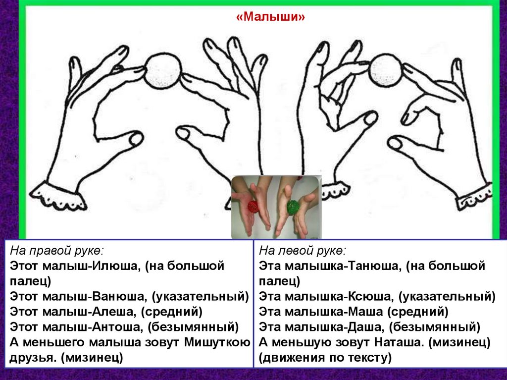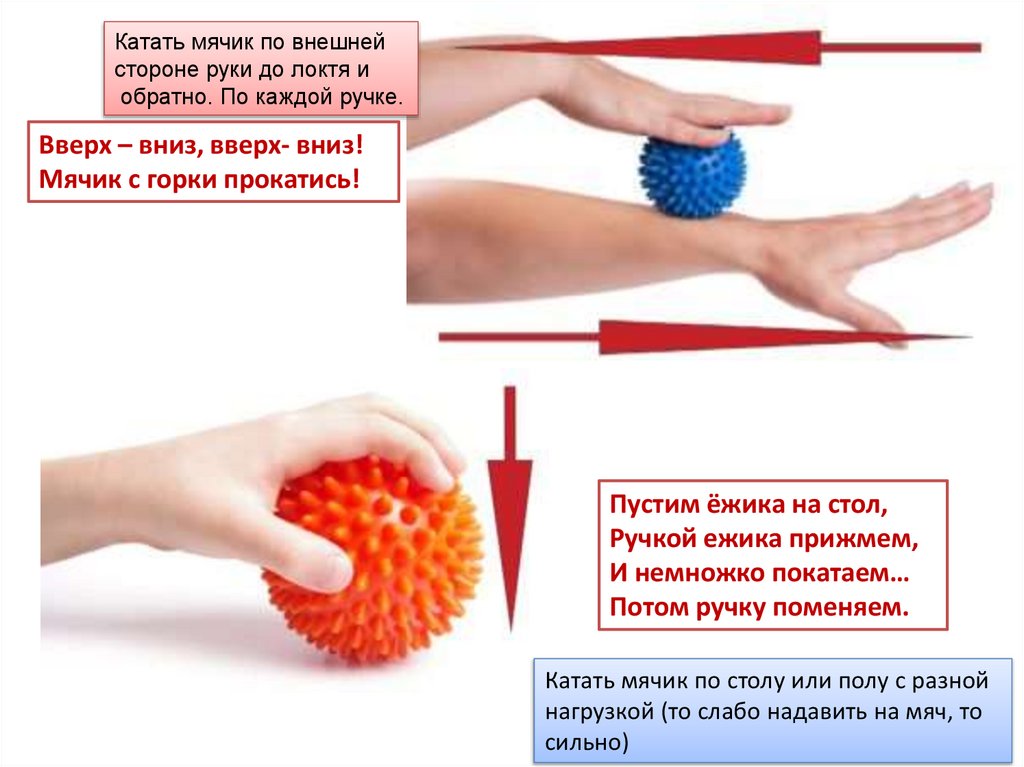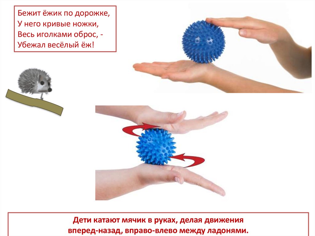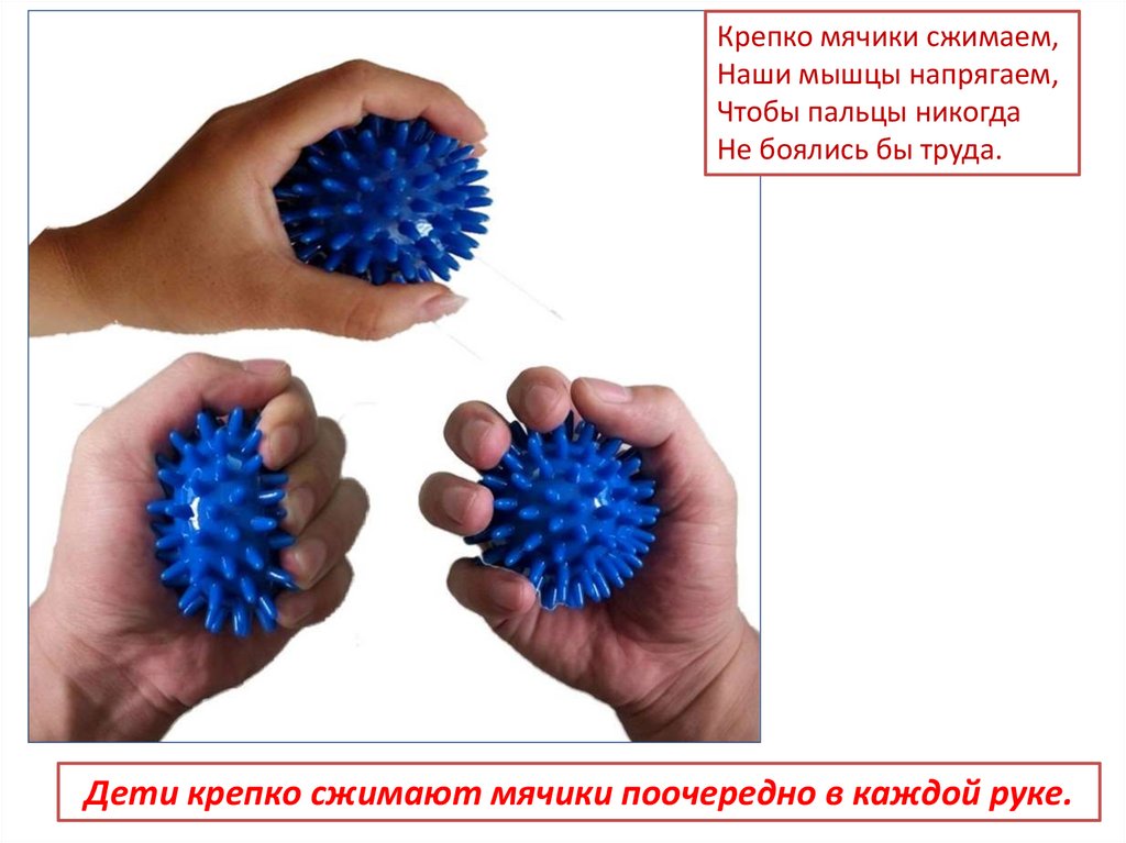 Дети крепко сжимают мячики поочередно в каждой руке.