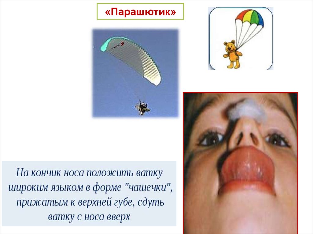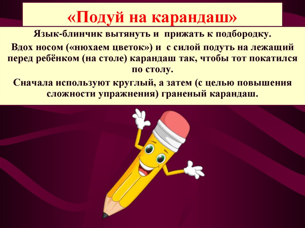 «Подуй на карандаш»Язык-блинчик вытянуть и прижать к подбородку.