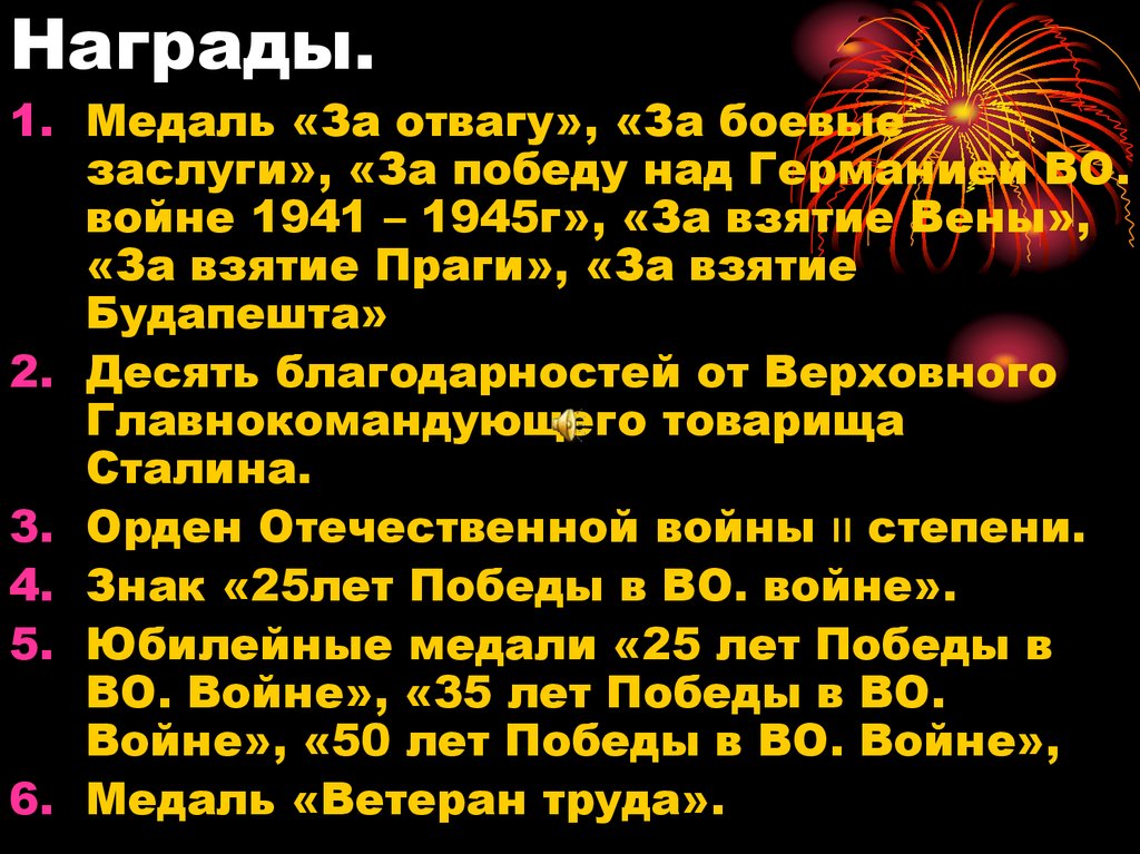1. Медаль «За отвагу», «За боевыезаслуги», «За победу над Германией ВО.